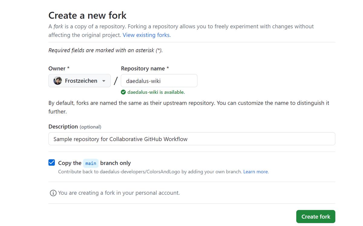 - You will be moved to the "Create a new fork" page. Fill up the form and click on "Create fork" to make your own fork of the project.
