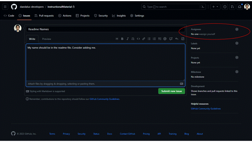 - Now that you've created the issue, one of the team members can now work on it (in this case, you will be the one to work on it). You should now be able to see a