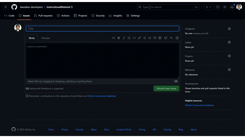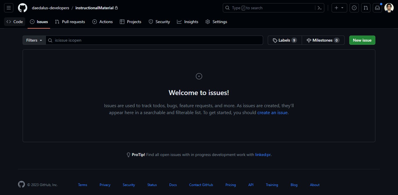 issuestab to start creating an issue for an enhancement. Select the green button at the right side of the screen wit he labelNew Issue.