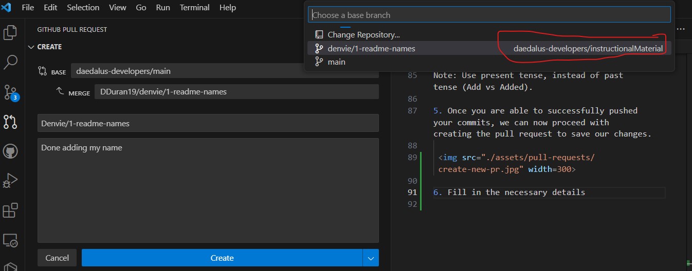 - Once you are able to successfully push your commits, we can now proceed with creating the pull request to save our changes.