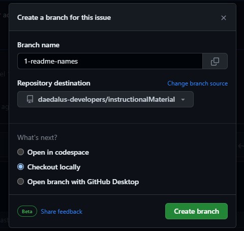 Create a branchand link it to your existing repo we forked earlier above. This will open up a modal asking you for the branch name. Follow code conventions, use your_username/feature_name.